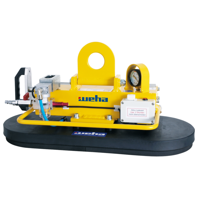 The vacuum is generated by a hand pump or a compressed air ejector, so no electricity is required. The vacuum is checked by means of an optical and acoustic warning device. Aluminum safety tank enables the workpiece to be set down even if the vacuum is lost.