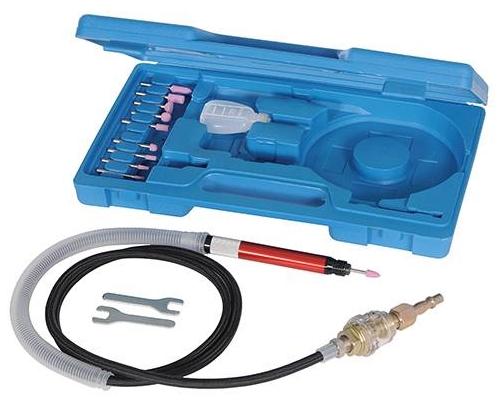Includes 10 grinder heads and built-in speed regulator for precise work. Kit has 1.5m air hose with protective sleeve. Working pressure 90psi. Average air consumption 2cfm. 54,000rpm. Includes in-line oiler, oiler bottle, spanners and carry case.