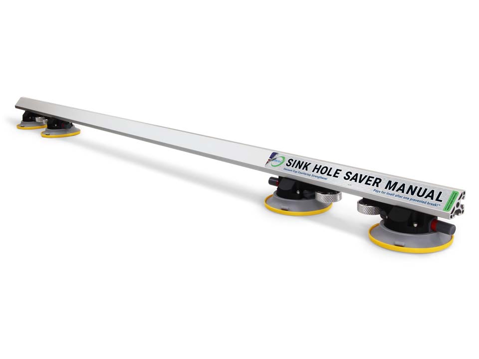 The NEW Sink Hole Saver™ Manual is a surface-mounted reinforcement system that strengthens fragile materials during lifting, transportation, and installation. This product features proprietary, non-marking vacuum cups with triple sealing rings for a strong, reliable hold—even on textured and leathered surfaces. Red-collar indicators on thumb pumps allow monitoring vacuum pressure at a glance, and the cups can be re-pumped in place without loss of remaining suction. New knurled lock-knobs allow quick repositioning of cups around cutouts. The Sink Hole Saver™ Manual is available in three lengths, with three optional accessories (Angle Bracket, Vertical Lifting Handle Kit, and Extension Bracket Kit), to provide a protection solution for any situation.
