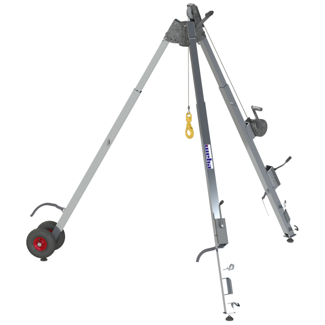 Light aluminium crane with integrated rope winch and centre of gravity shifting.