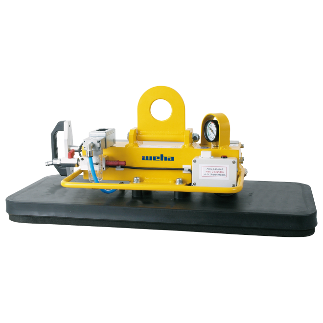 The vacuum is generated by a hand pump, so no electricity or compressed air is required. The vacuum is checked by means of an optical and acoustic warning device. Aluminum safety tank enables the workpiece to be set down even if the vacuum is lost.