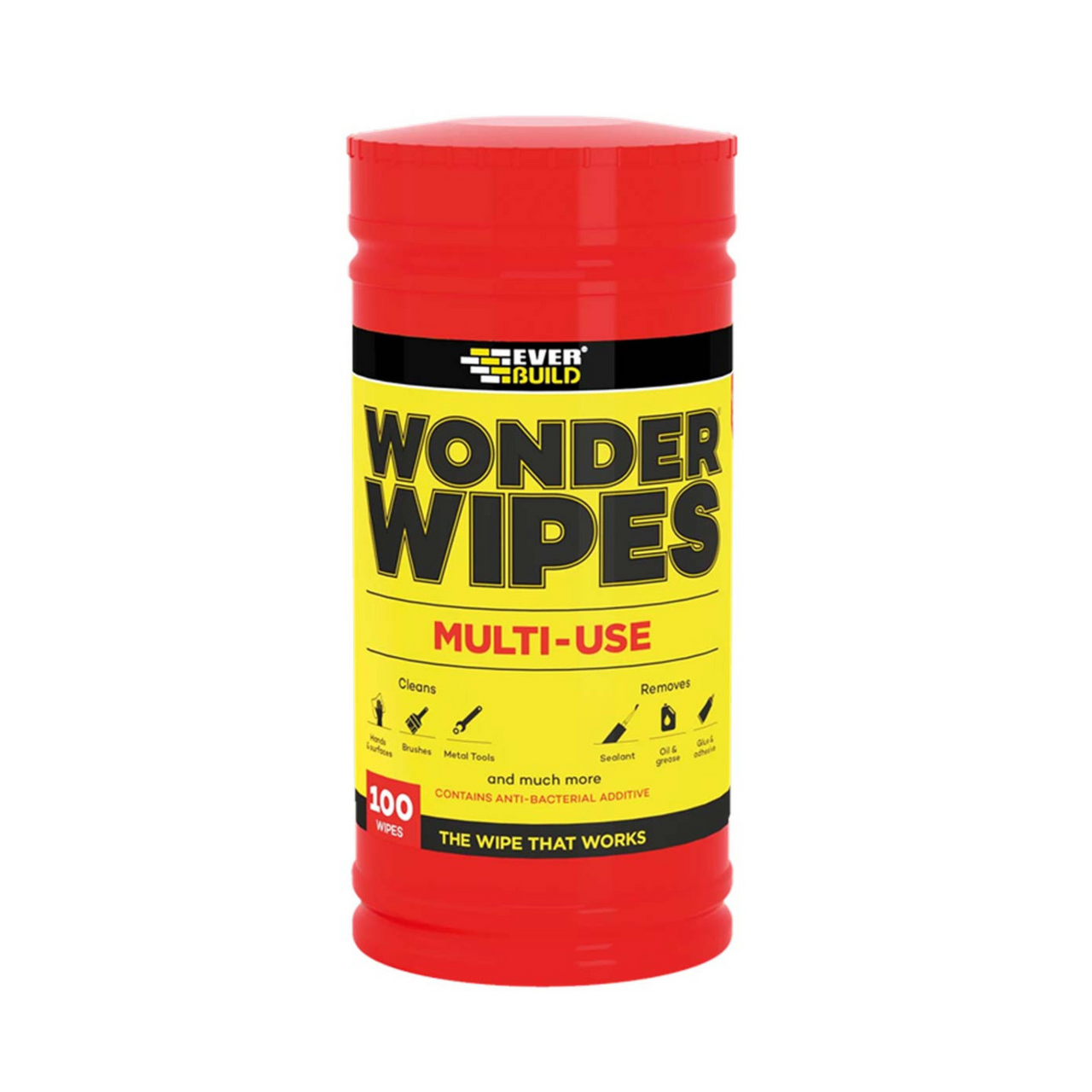 Multi-use Wonder Wipes have become the first choice wipe of the nations builders and tradesmen. Specially formulated to clean hands, tools and surfaces from wet and semi-cured paint, sealant, adhesive, bitumen, expanding foam, oil, grease and even silicone. Particularly useful when there is no water on site. Available in dispensing tubs. Everbuild Wonder Wipes now contain a powerful Anti-Bacterial Additive that is tested by an independent laboratory to the standards for killing bacteria on dirty surfaces and hands. Resistant to MRSA, Salmonella, Listeria and E.Coli